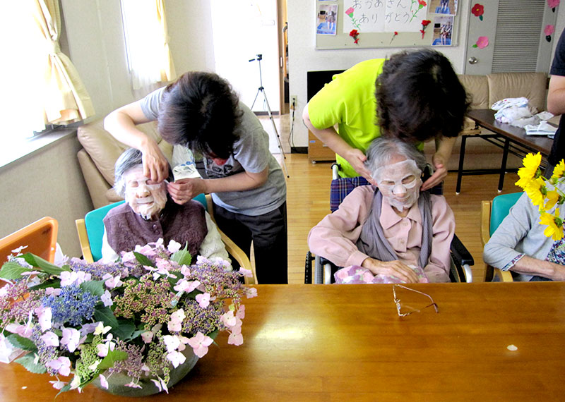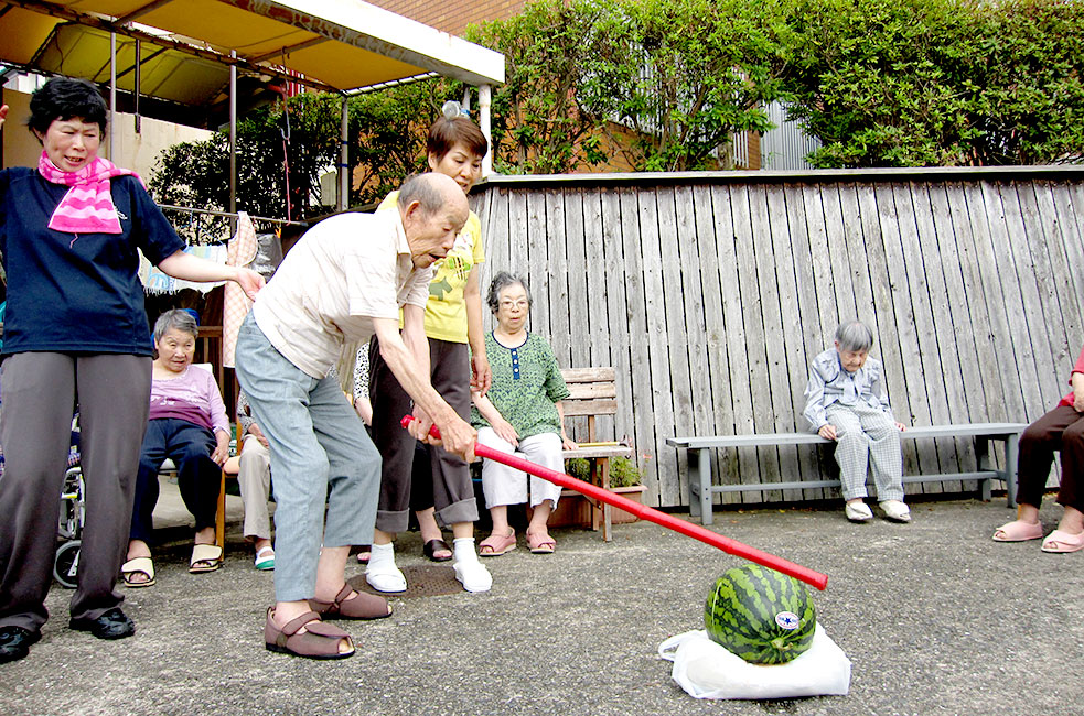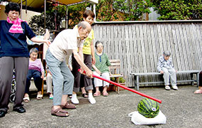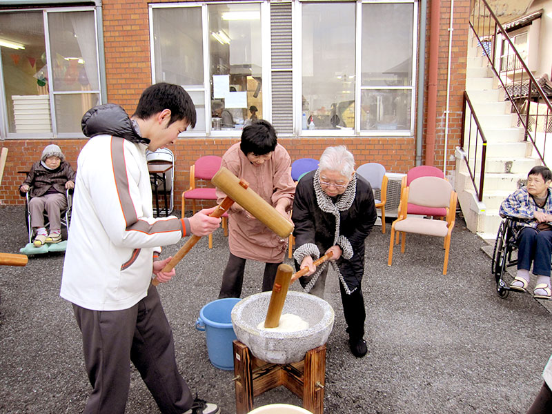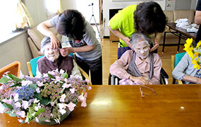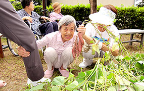 日常生活として食事、入浴、リハビリ、カラオケ・作品の制作・季節を感じる外出・運動会・餅つき等のレクレーション、ミニ菜園の収穫、医療機関の往診があります。また訪問歯科、訪問理美容も実施されています。