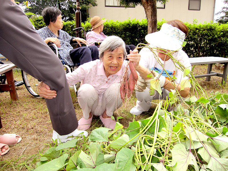 お庭での足湯、ひなたぼっこ、ミニ菜園でトマト・イモ等の収穫など、12名の入居者様とご一緒にワイワイ・ガヤガヤ過ごしています。