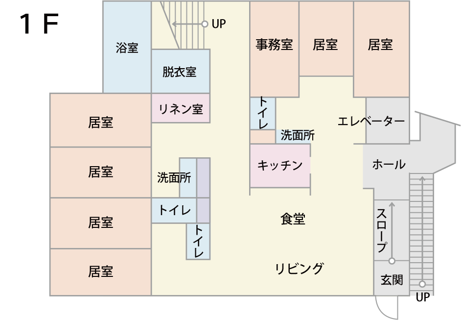 入居者定員6名のフロアーが1階・2階にあり、合計12名様の施設です。