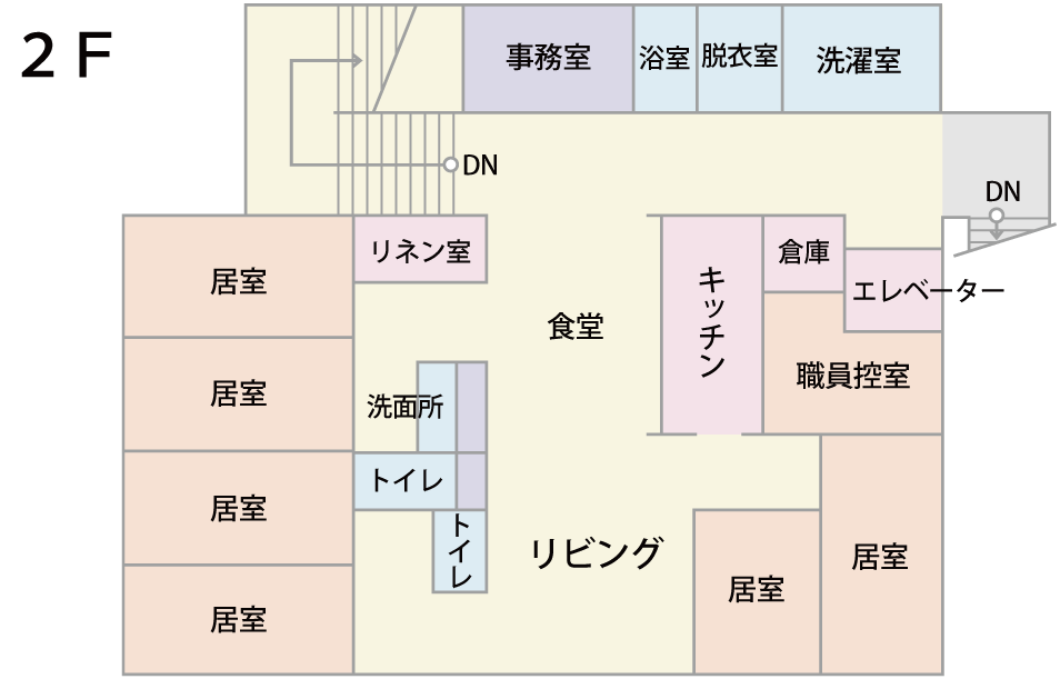食堂兼リビングを中心に居室(6室)が配置され、アットホームな生活の中で、きめこまやかにかかわりながら、ご入居者様の暮らしのサポートを致します。